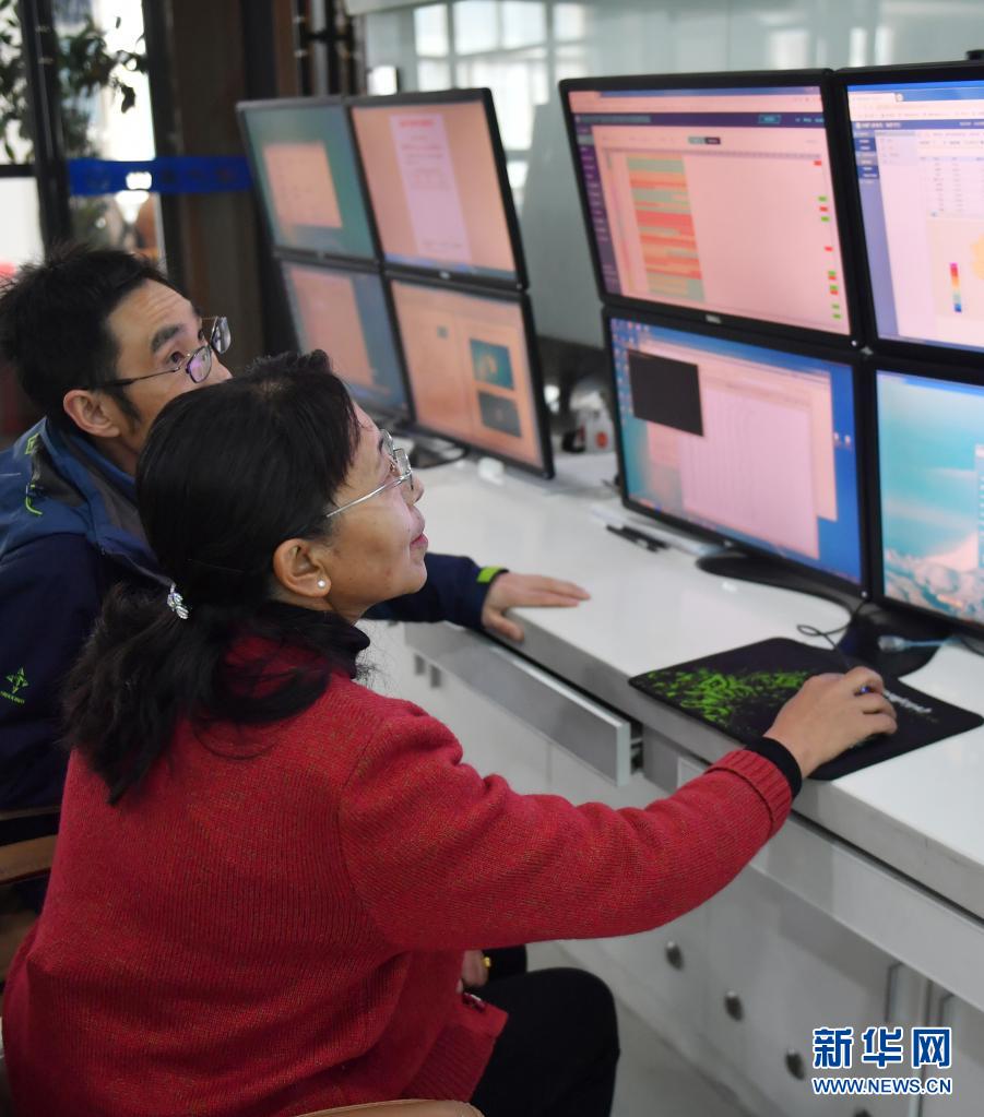 卓玛(右)和同事在西藏自治区气象局的办公室讨论气象数据(3月12日摄)。