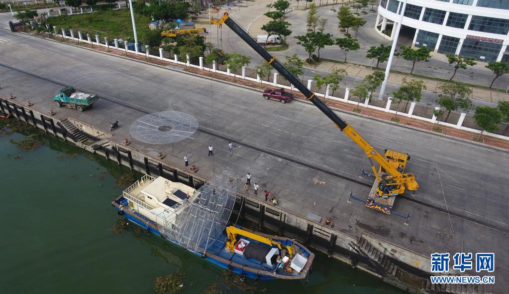 在海南三亚崖州中心渔港,吊车将大型类礁人工苗圃起吊装船(2020年11月18日摄,无人机照片)。