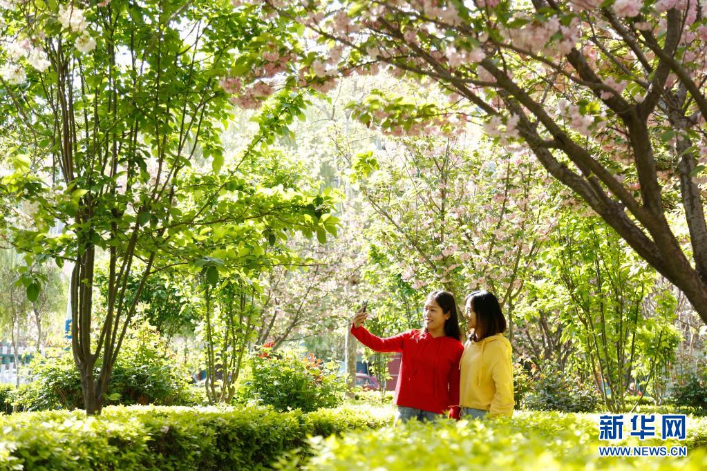 4月13日,居民在邢台市南和区和阳镇一公园内赏花留影。
