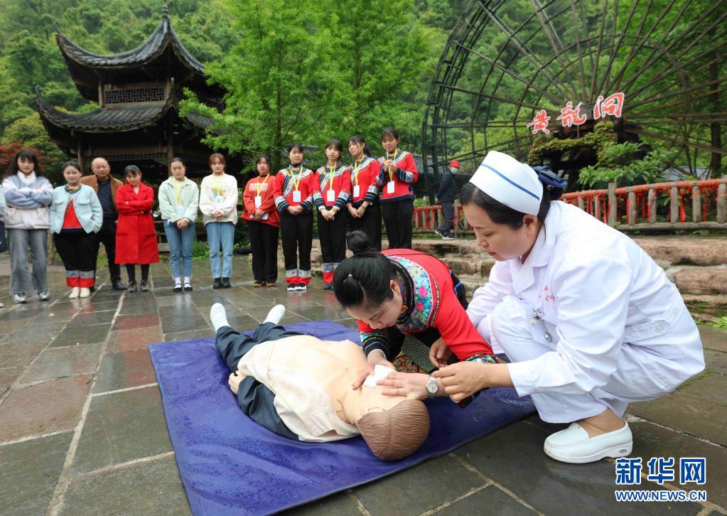4月13日,张家界市武陵源区人民医院的医护人员指导黄龙洞景区工作人员现场救护。