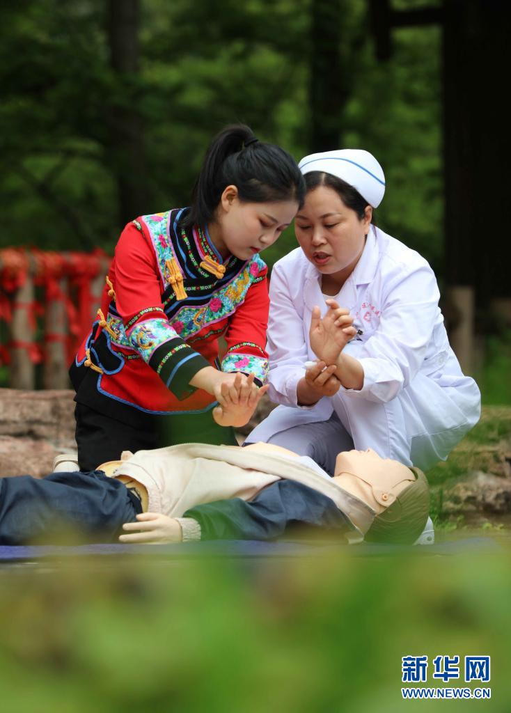 4月13日,张家界市武陵源区人民医院的医护人员指导黄龙洞景区工作人员现场救护。