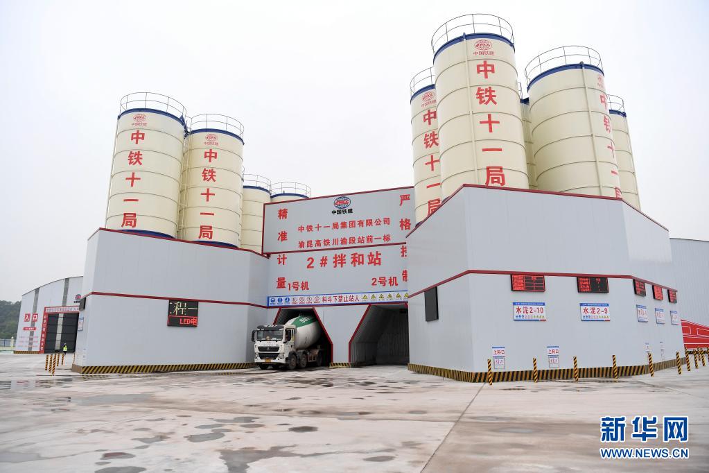 4月13日,一辆混凝土运输罐车在渝昆高铁川渝段站前一标2号拌和站作业。