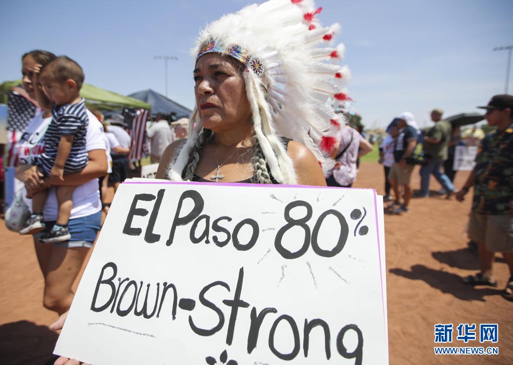 在美国得克萨斯州埃尔帕索市,印第安裔美国人普丽西拉·佩雷斯手举标语参加反种族主义集会(2019年8月7日摄)。