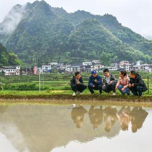 4月12日,在贵州省麻江县,南京农业大学教授李刚华(左二)带着学生与种粮大户赵祥榕(右一)商讨水稻播种育苗相关事宜。