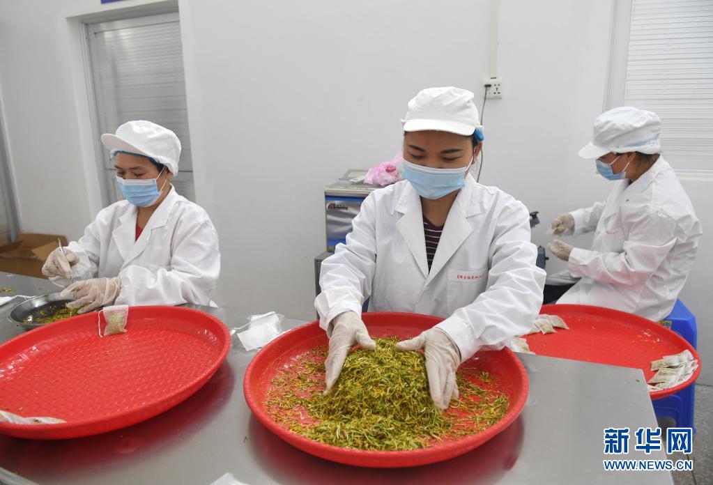 4月13日,在马山县加方乡大陆村,村民在包装金银花。