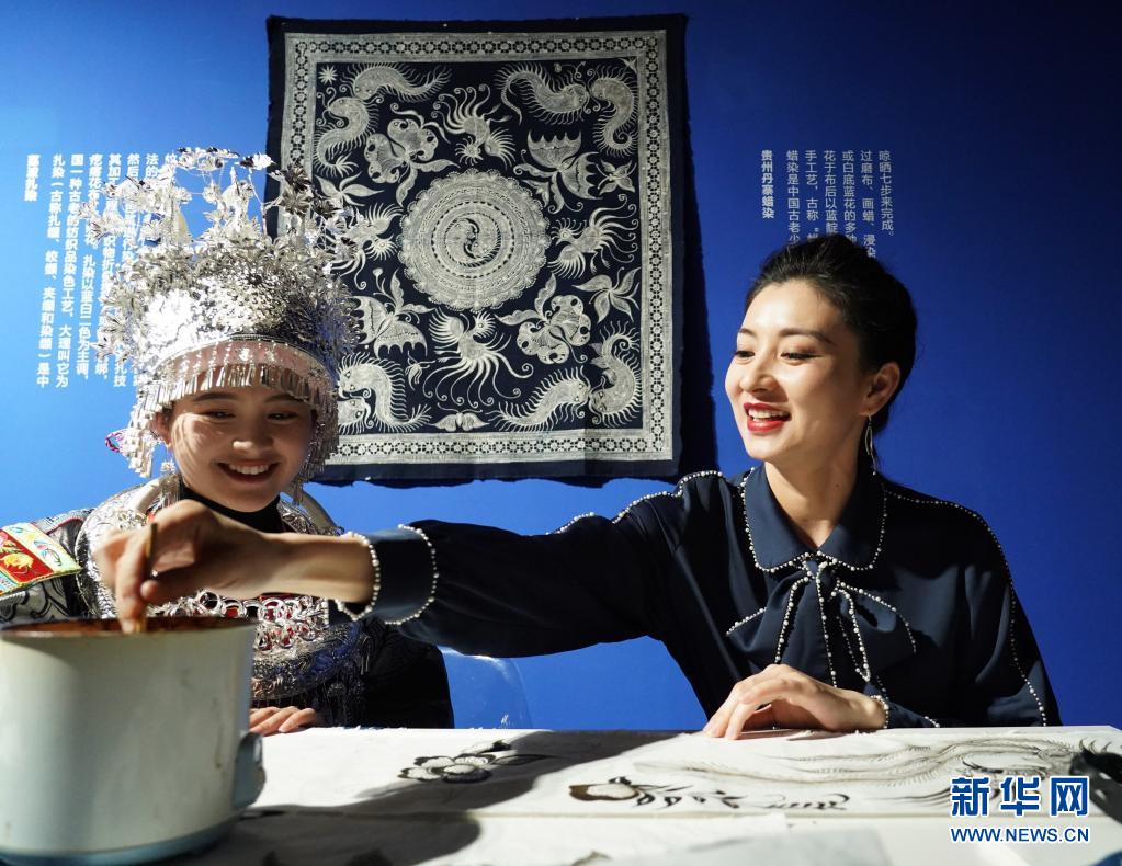 4月13日,演员、“天才妈妈”公益项目传播官斓曦(右)在“约会天才妈妈——她爱非遗艺术展”上向贵州丹寨蜡染传承人学习蜡染技艺。