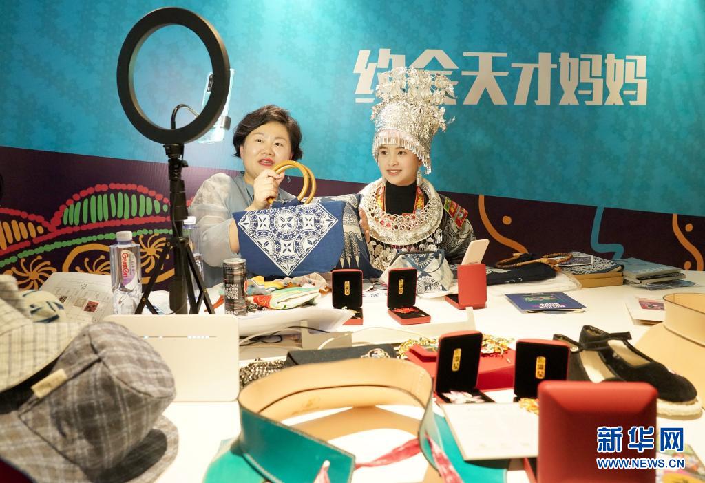 4月13日,来自贵州丹寨的王欣颖(右)在“约会天才妈妈——她爱非遗艺术展”上通过直播销售家乡蜡染手工艺品。