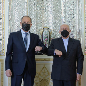 4月13日,伊朗外长扎里夫(右)在德黑兰与俄罗斯外长拉夫罗夫碰肘致意。