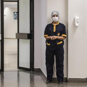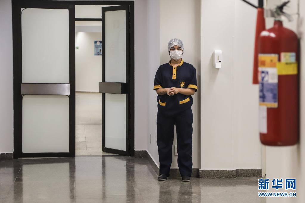 4月13日,一名工作人员站在巴西圣保罗刚落成的医院内。
