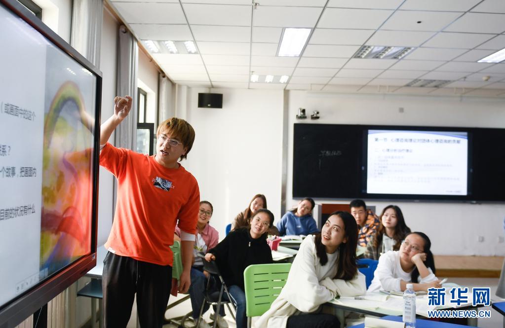 4月14日,青海民族大学师范学院学生使用互动屏幕进行课堂交流。