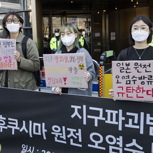 4月14日,韩国民众在位于首尔的日本驻韩国大使馆外集会,抗议日本政府将福岛核废水排入大海。日本政府13日召开有关内阁会议,正式决定将福岛第一核电站上百万吨核废水经过滤并稀释后排入大海,排放将于约2年后开始。新华社发(徐儒锡摄)