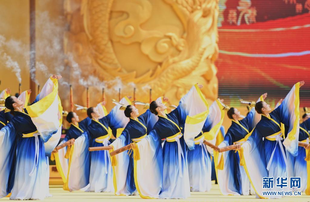 4月14日,演员在辛丑年黄帝故里拜祖大典上表演。当日,辛丑年黄帝故里拜祖大典在河南郑州举行,大典的主题为“同根同祖同源,和平和睦和谐”。新华社记者 张浩然 摄