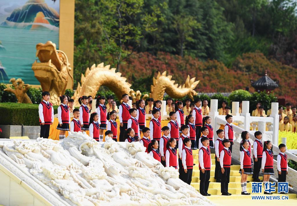 4月14日,小朋友在辛丑年黄帝故里拜祖大典上合唱《黄帝颂》。当日,辛丑年黄帝故里拜祖大典在河南郑州举行,大典的主题为“同根同祖同源,和平和睦和谐”。新华社记者 张浩然 摄