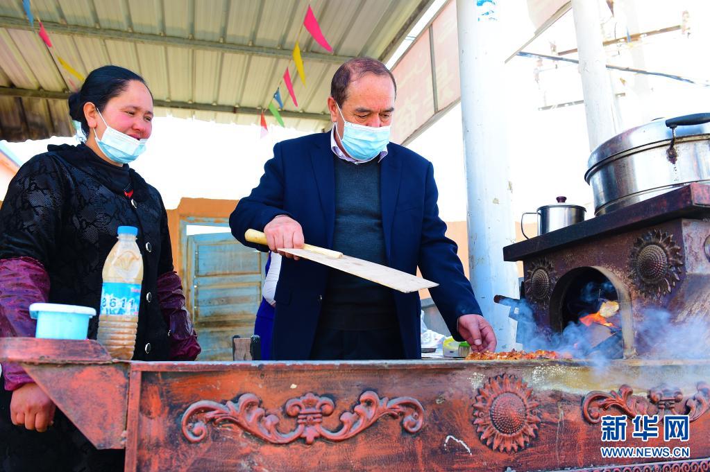 新疆大学驻巴仁乡库勒艾日克村工作队队长艾则孜·托合提(右)为经营饭馆的村民帮忙(4月9日摄)。