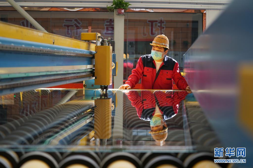 4月14日,河北省沙河市鸿昇玻璃有限公司的工人在车间内查看生产线运转情况。