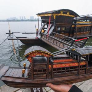 “船模不是玩具,而是历史、文化。”韩鸣华对待船模制作非常严谨,他的团队制作的红船,船身、头龙门、利市头、稍龙门等比例都恰到好处,舱外桅杆、缆绳桩、船橹,舱内椅凳、案几一应俱全,与嘉兴南湖湖心岛停靠的红船还原度极高。