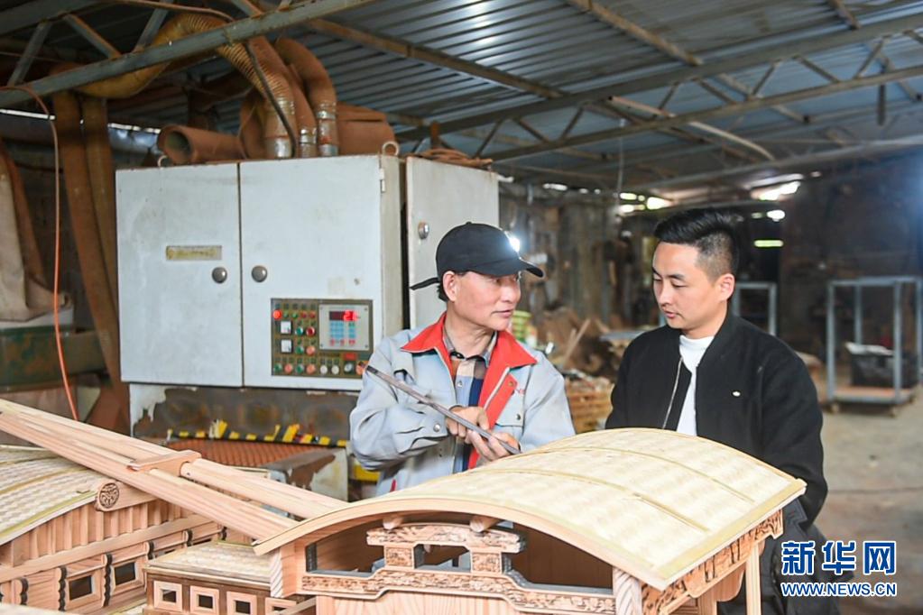 4月13日,韩鸣华(左)在车间内与自己的徒弟交流红船模型部件的制作技艺。