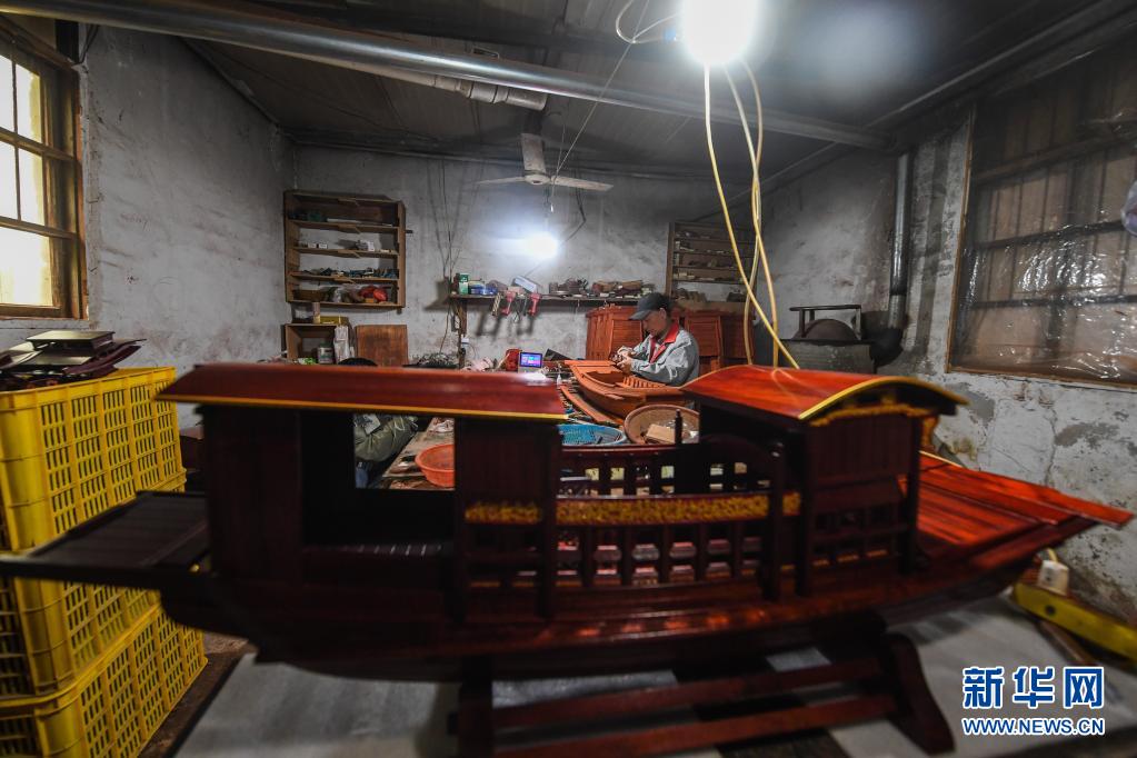 4月13日,在位于嘉兴市南湖区余新镇的嘉兴市鸣华船模制作有限公司车间内,67岁的韩鸣华在制作一艘红船模型。