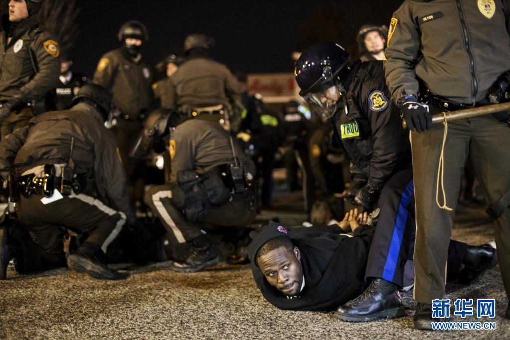 2014年11月28日,警察在美国密苏里州弗格森警察局前逮捕示威者。当晚,约100多名示威者阻断了弗格森警察局前的交通,抗议美国密苏里州圣路易斯县大陪审团决定不起诉枪杀非洲裔青年迈克尔·布朗的白人警察达伦·威尔逊。