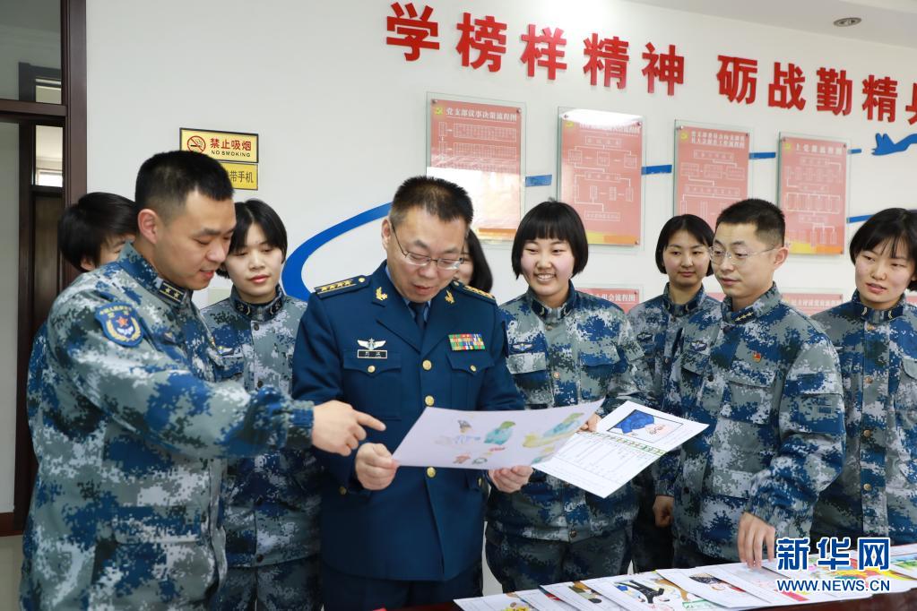 全军党史学习教育宣讲团成员、空军工程大学教授刘江(前左二),在中部战区空军某通信营组织的党史漫画展评现场,与官兵一起讲述漫画背后的党史故事(3月22日摄)。新华社发(周雪峰 摄)