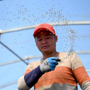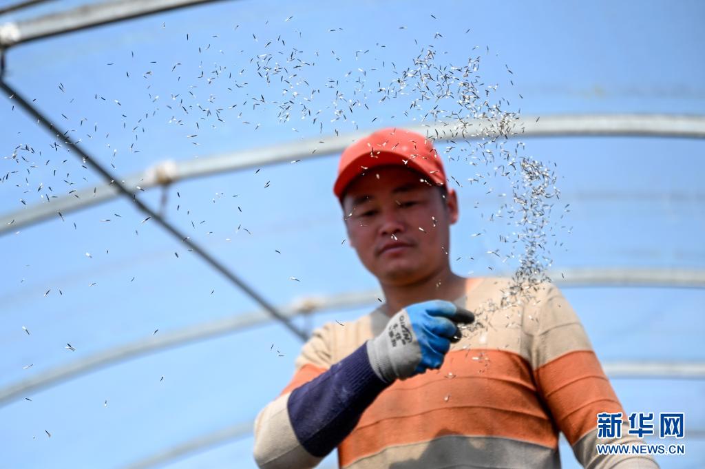 4月14日,农民在内蒙古自治区兴安盟扎赉特旗好力保镇一处大棚里播撒花种。