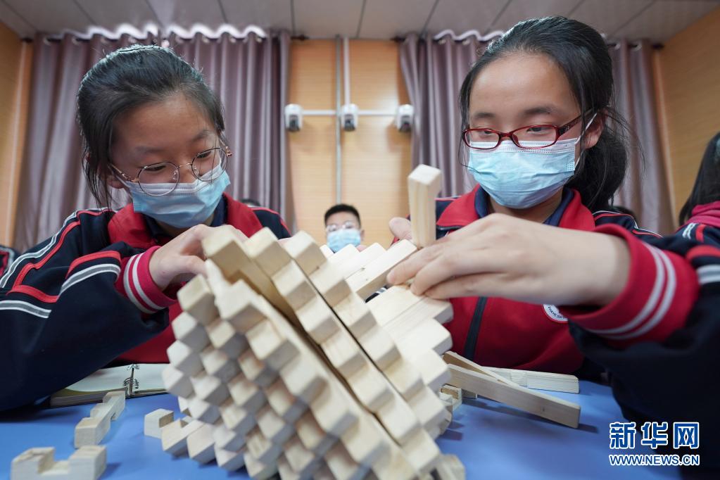4月14日,河北省沙河市第四中学学生体验孔明锁。