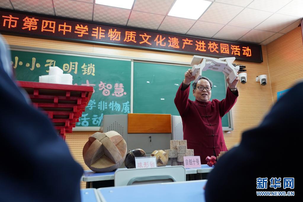 当日,河北邢台沙河市第四中学开展“小小孔明锁 传承大智慧”非遗进校园活动,邀请当地孔明锁制作艺人侯全辰走进课堂,为学生们讲解孔明锁制作技艺和中国传统榫卯结构的相关知识。