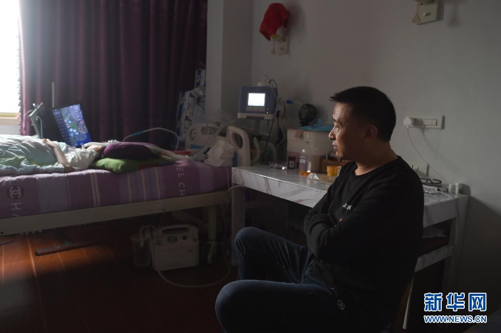 父亲包宗锋坐在床边随时“待命”(4月13日摄)。包宗锋被检查出脑血管畸形,因为要照看孩子,一直不敢去做手术。