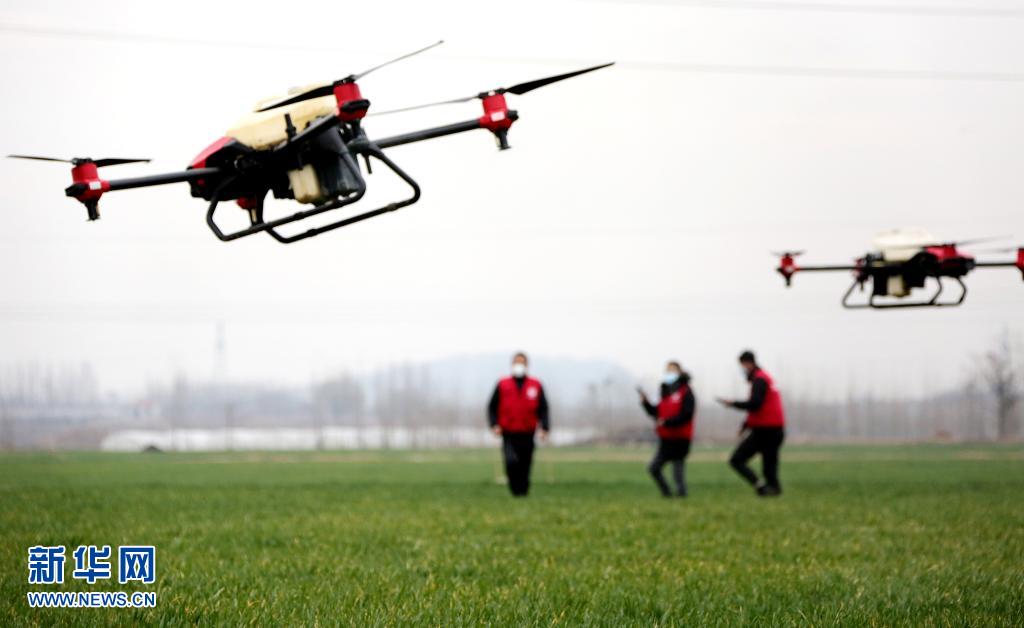 在山东省枣庄市市中区税郭镇野岗埠村,工作人员使用植保无人机在麦田里喷洒除草剂(2月27日摄)。
