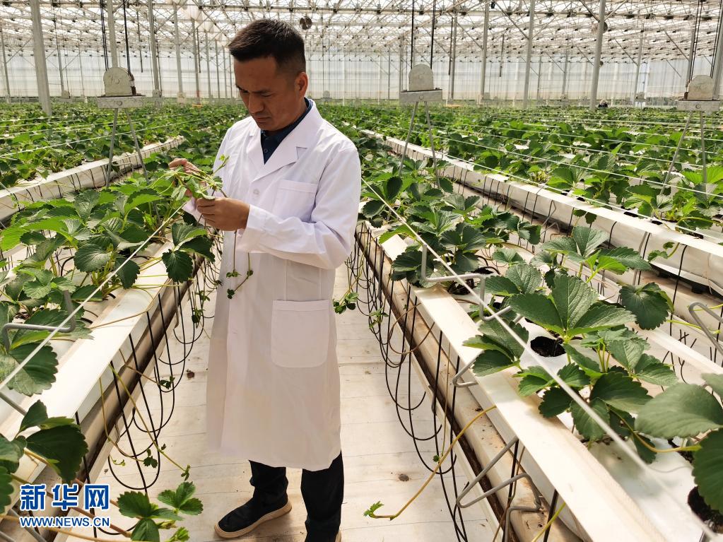 云南省农科院花卉研究所研究员阮继伟查看草莓种苗长势(4月14日摄)。