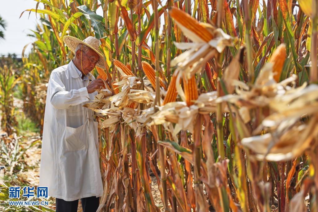 玉米育种专家程相文在三亚南繁育种基地观察玉米生长情况(2月24日摄)。