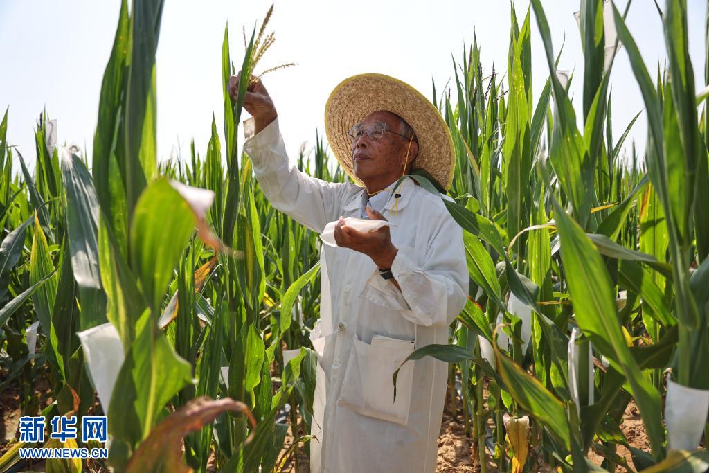 玉米育种专家程相文在三亚南繁育种基地对玉米进行采粉(2月24日摄)。