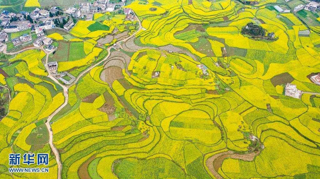 这是贵州省六盘水市六枝特区木岗镇的油菜花田(3月5日摄,无人机照片)。