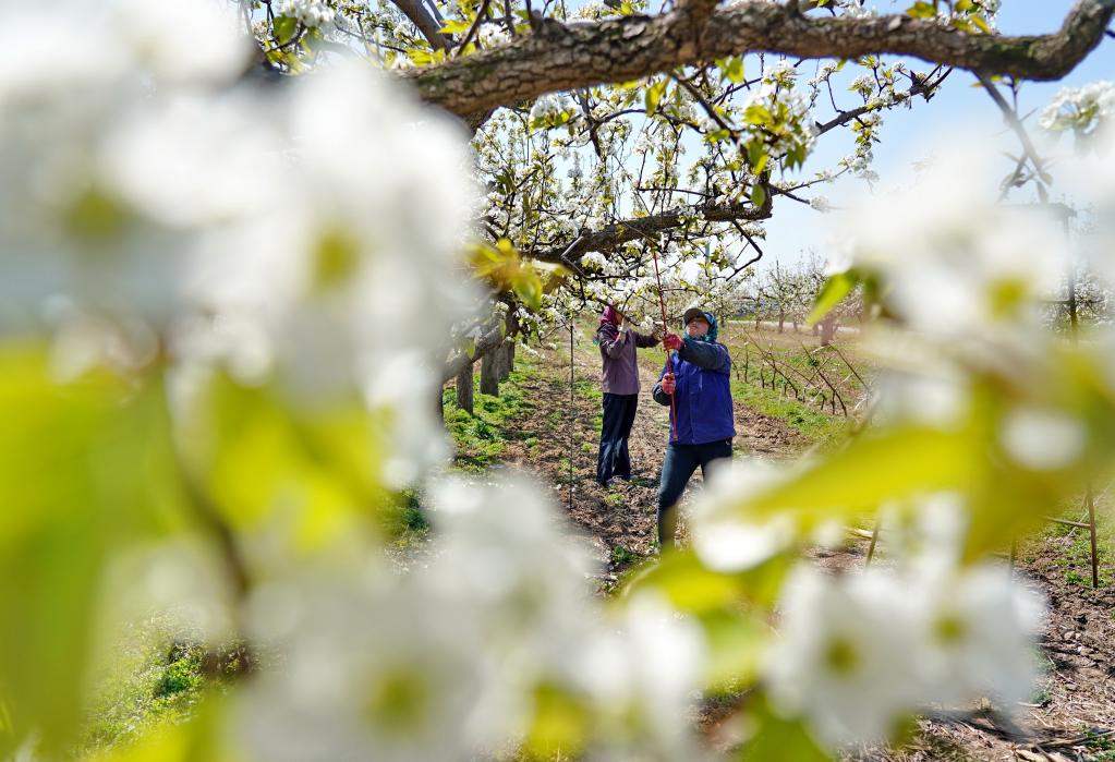 4月15日,唐山市丰南区黄各庄镇红花园村农民在梨园内给梨树疏花。近日,河北省唐山市丰南区梨树陆续开花,果农抢抓农时给梨树进行疏花,提高坐果率和果品品质,促进增产增收。新华社记者 牟宇 摄