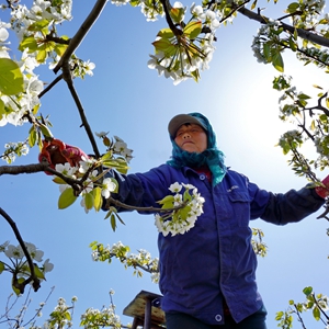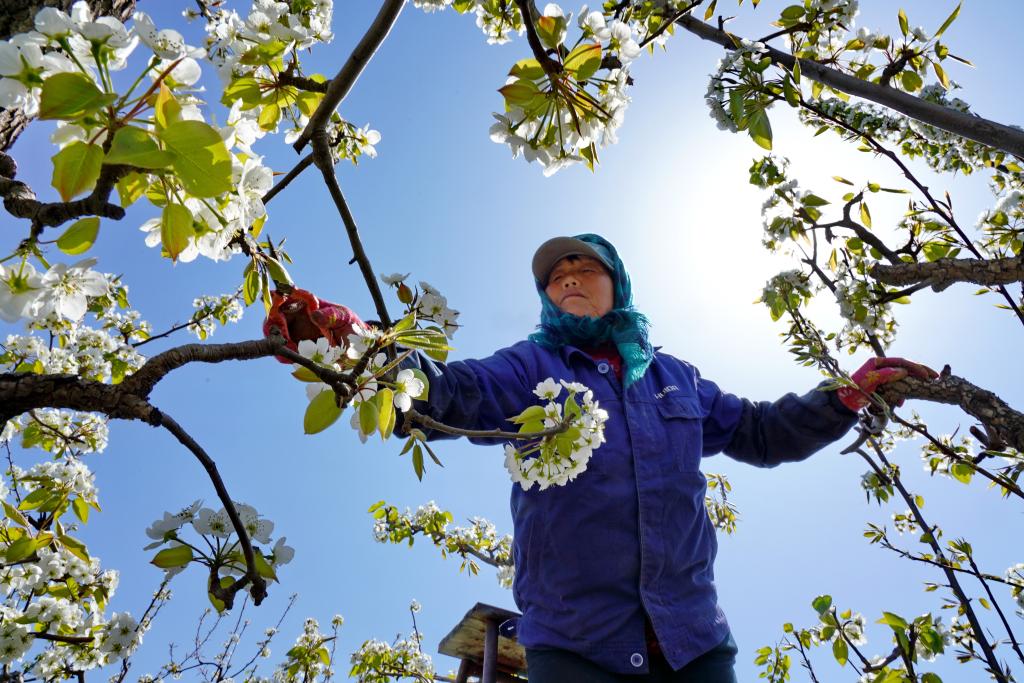 4月15日,唐山市丰南区黄各庄镇红花园村农民在梨园内给梨树疏花。近日,河北省唐山市丰南区梨树陆续开花,果农抢抓农时给梨树进行疏花,提高坐果率和果品品质,促进增产增收。新华社记者 牟宇 摄