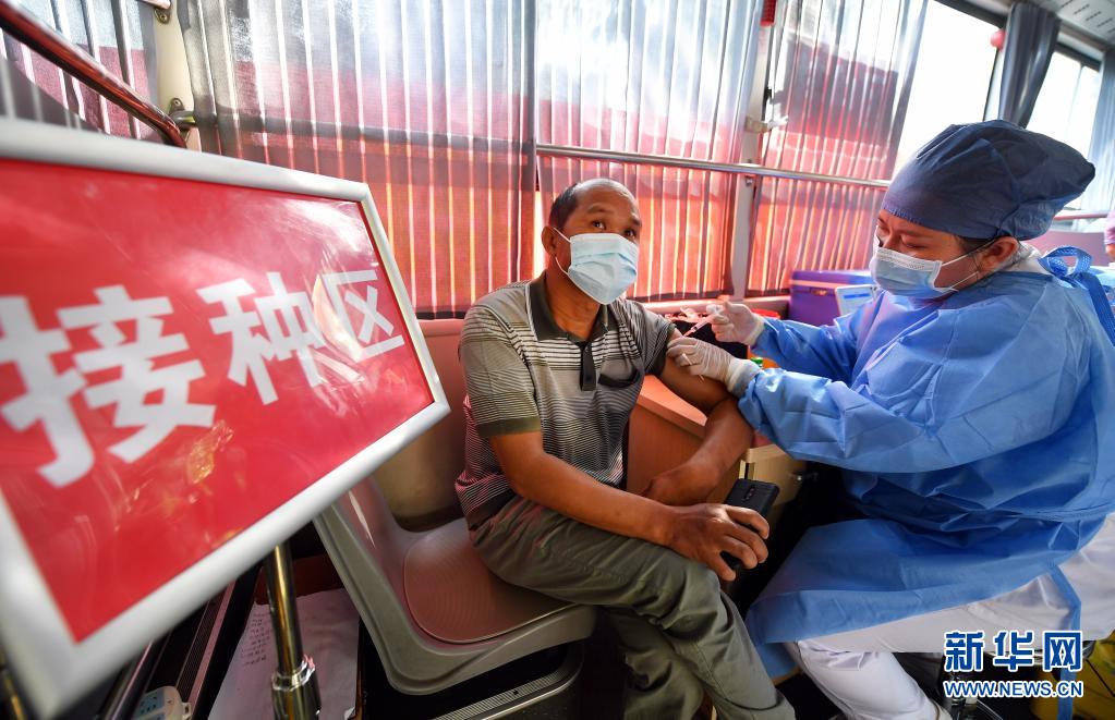 4月15日,在海口市琼山区椰博路,医护人员在疫苗移动接种车上为市民接种新冠疫苗。近日,20辆新冠疫苗移动接种车开进海口社区、企业等地,为出行不便、路途远或工作时间不好调配的人群提供便捷的接种服务。新华社记者 郭程 摄