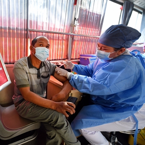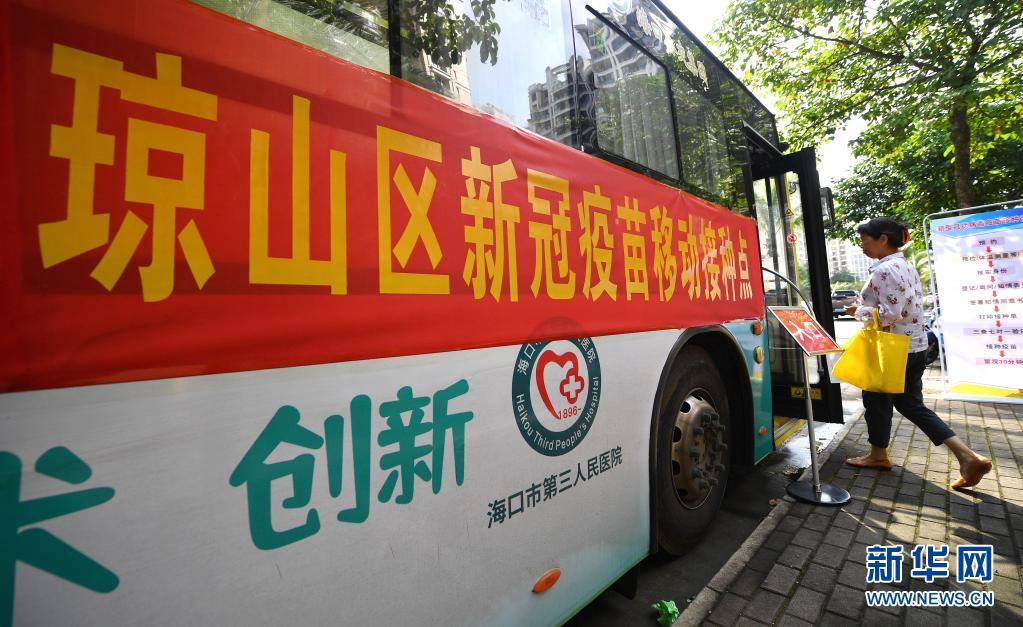 4月15日,在海口市琼山区椰博路,市民从疫苗移动接种车的前门进入准备接种疫苗。近日,20辆新冠疫苗移动接种车开进海口社区、企业等地,为出行不便、路途远或工作时间不好调配的人群提供便捷的接种服务。新华社记者 郭程 摄