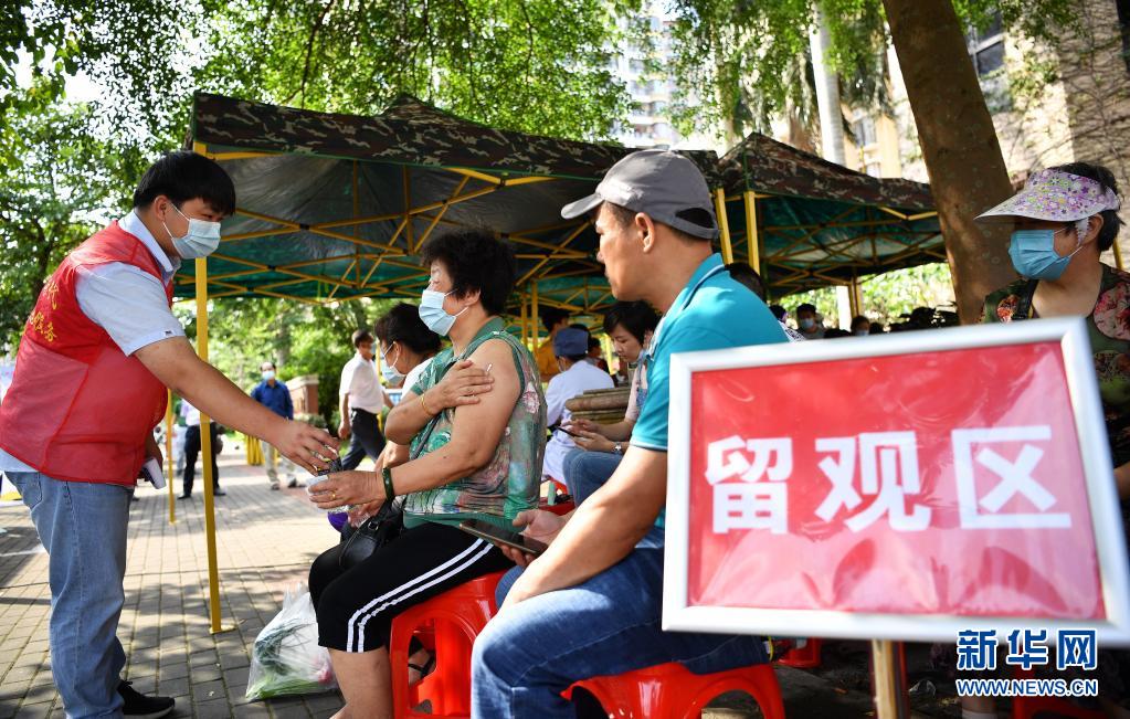4月15日,在海口市琼山区椰博路,志愿者为接种完疫苗的市民送上矿泉水。近日,20辆新冠疫苗移动接种车开进海口社区、企业等地,为出行不便、路途远或工作时间不好调配的人群提供便捷的接种服务。新华社记者 郭程 摄