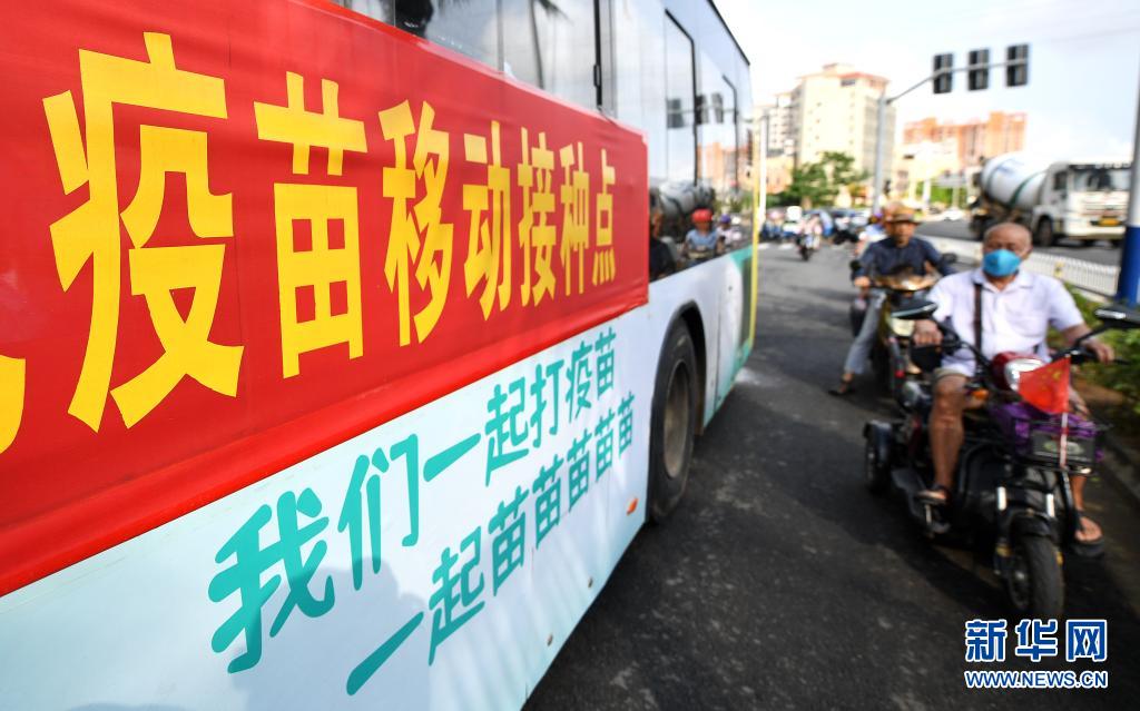 4月15日,在海口市琼山区椰博路,市民从疫苗移动接种车前经过。近日,20辆新冠疫苗移动接种车开进海口社区、企业等地,为出行不便、路途远或工作时间不好调配的人群提供便捷的接种服务。新华社记者 郭程 摄