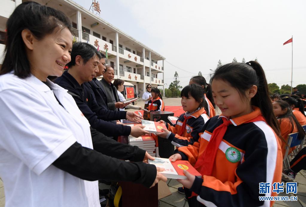 4月15日,志愿者向六安市金安区孙岗镇许小河学校学生发放红色经典图书。新华社发(徐旻昊 摄)