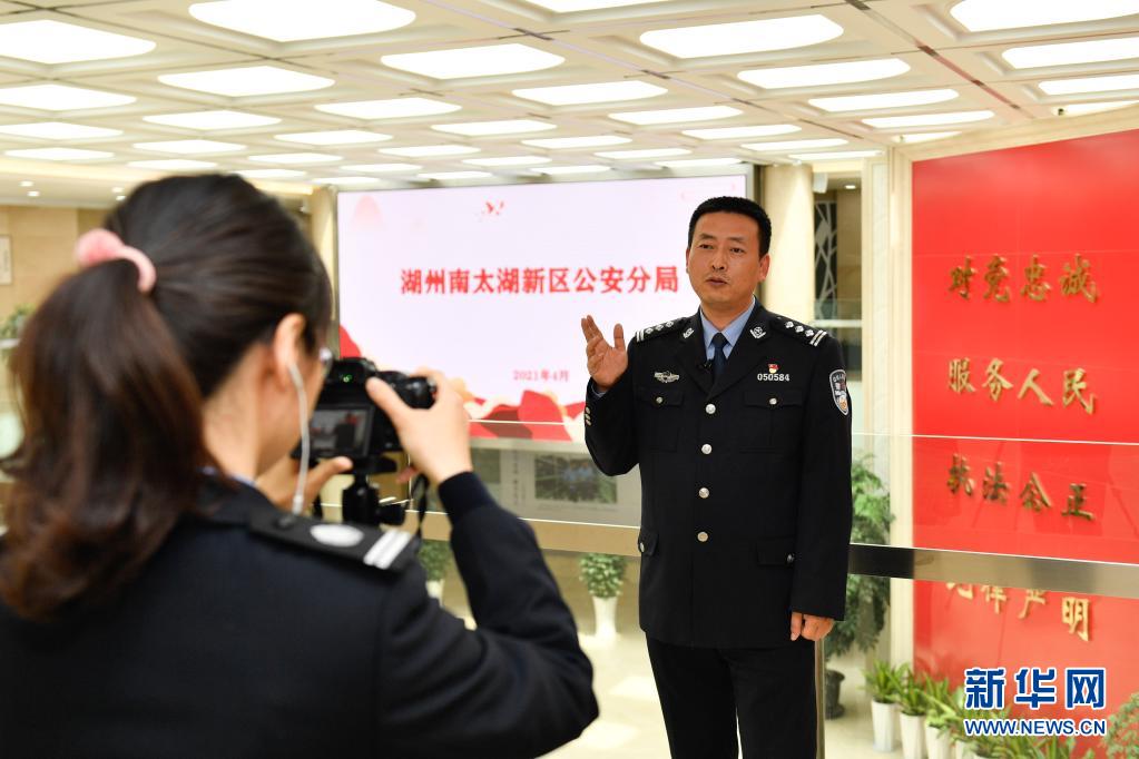 4月15日,湖州市南太湖新区公安分局民警在录制电信网络诈骗防范视频,以剖析案例的方式向群众宣传。