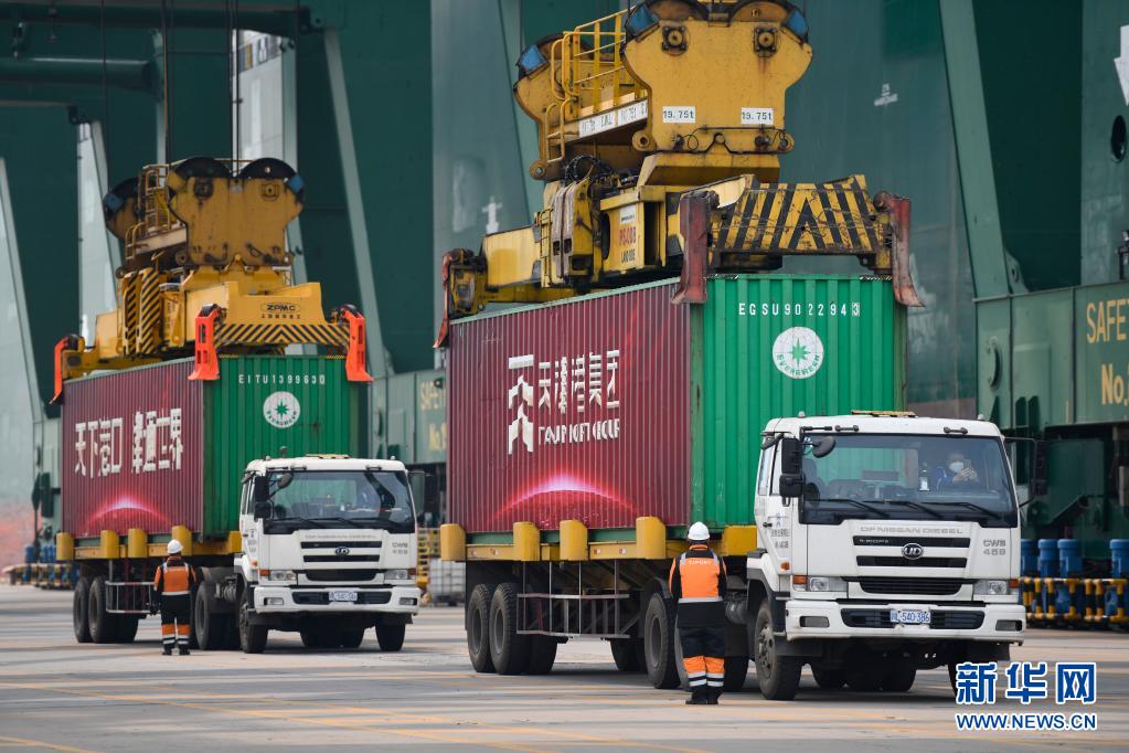天津港工作人员在向一艘长荣旗下的货轮装载集装箱(2021年4月9日摄)。当日,全球最大集装箱海运联盟——海洋联盟在天津港开通欧洲新航线,这也是天津港今年新开通的首条外贸远洋干线。