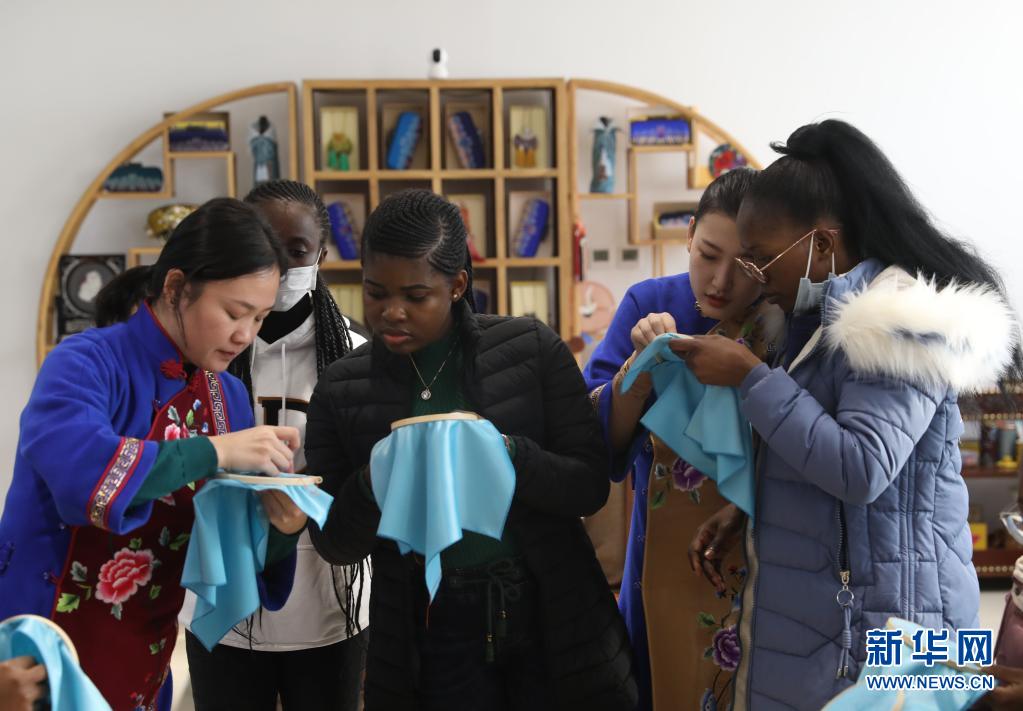 在沈阳盛京满绣工作室,留学生在满绣老师指导下体验满绣技艺(2021年3月3日摄)。