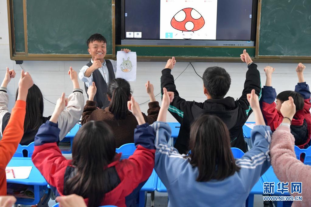 在江西省万载县特殊教育学校,唐友良在给听障孩子们上美术课(4月14日摄)。