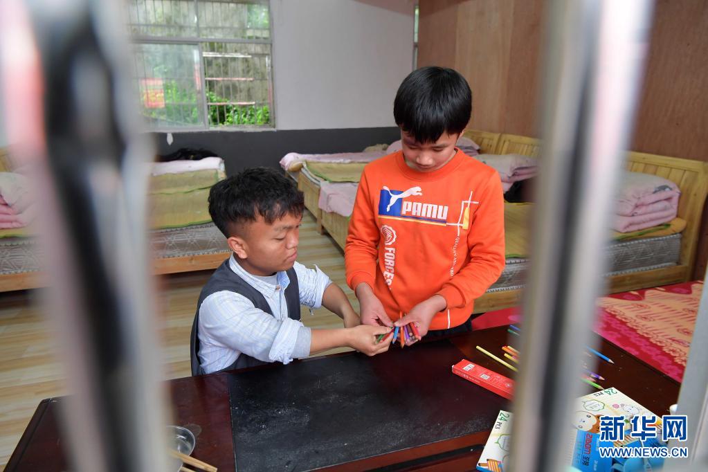 在江西省万载县特殊教育学校,唐友良在学生宿舍指导学生整理画笔(4月14日摄)。
