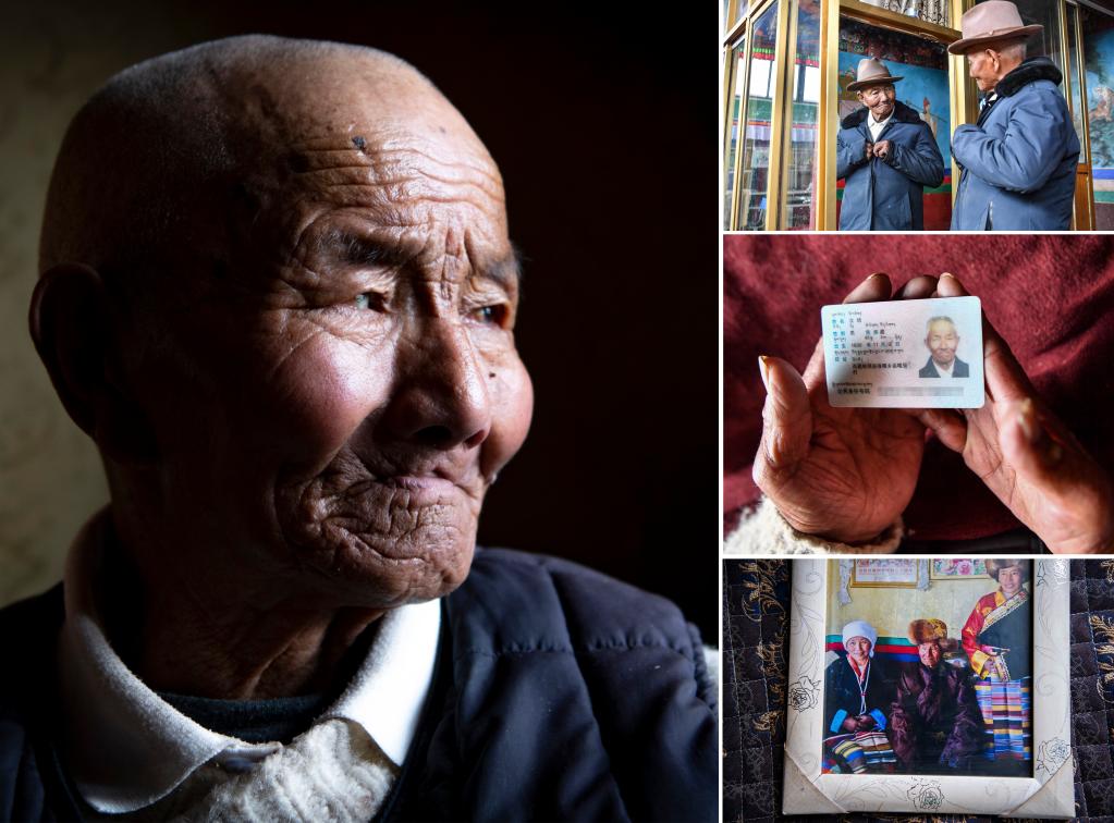 这是一张拼版照片,左图为次培的肖像(3月22日新华社记者普布扎西摄);右上图为次培老人在家里整理衣服(3月22日新华社记者晋美多吉摄);右中图为次培老人的身份证(3月22日新华社记者晋美多吉摄);右下图为次培老人和女儿们的合影(3月22日新华社记者普布扎西摄)。