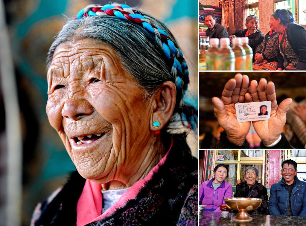 这是一张拼版照片,左图为边巴仓决的肖像(3月19日新华社记者张汝锋摄);右上图为边巴仓决(左二)和邻居在家里拉家常(3月19日新华社记者孙瑞博摄);右中图为边巴仓决的身份证(3月19日新华社记者孙瑞博摄);右下图为边巴仓决和孙子孙媳在一起(3月19日新华社记者张汝锋摄)。
