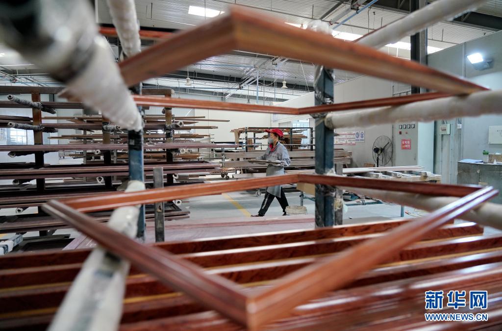 4月16日,河北省唐山市汉沽管理区宅本木业有限公司工人在车间内搬运家具部件。
