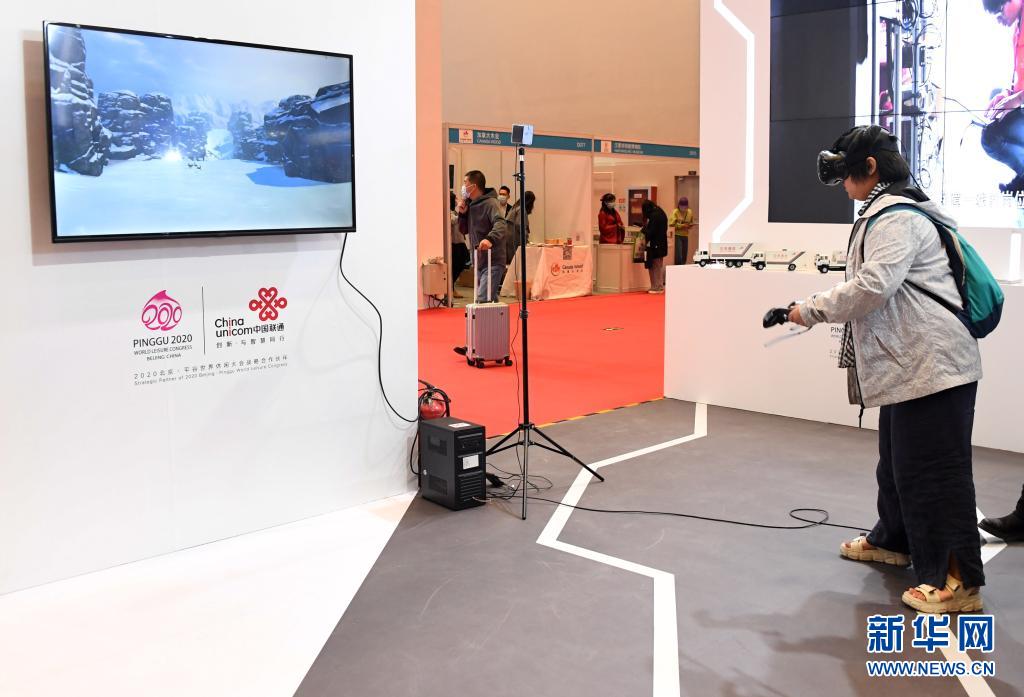 4月16日, 在中国(北京)国际休闲产业博览会上,一名观众体验VR滑雪。