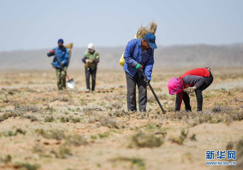 随着气温回升,在内蒙古自治区阿拉善盟的戈壁深处,工人开始种植梭梭,防治荒漠化。据了解,阿拉善左旗今年已完成造林面积30.6万亩,主要种植梭梭、花棒等植物。